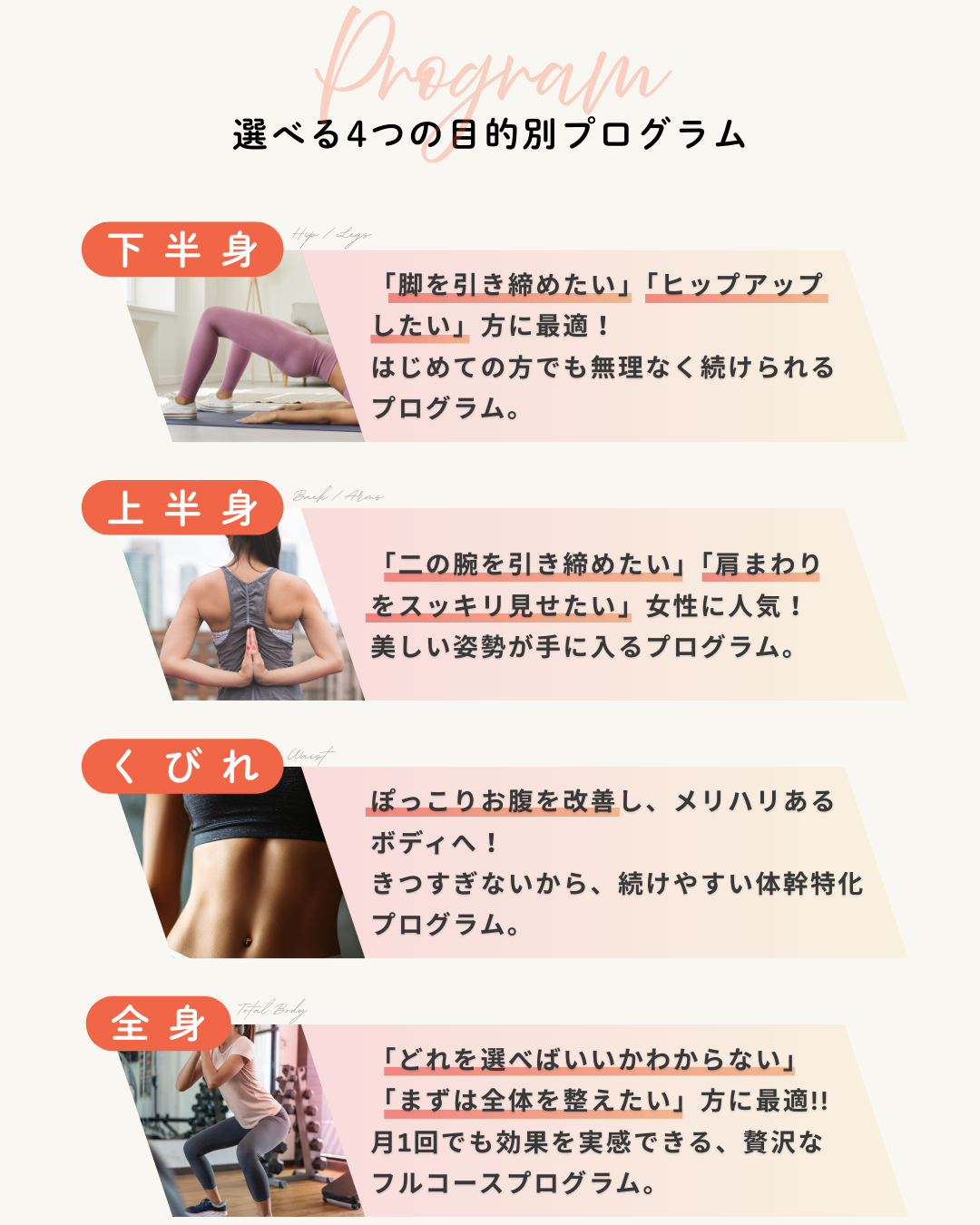 お客様のご予約に関して、以下のキャンセル規定を定めております。ご確認のうえ、ご理解・ご協力をお願いいたします。 ① キャンセル期限について ・キャンセル・日程変更は、前日21:00までにご連絡ください。 ・上記期限を過ぎた場合は、キャンセル料として1回分消化(100%)となります。 ② 当日キャンセル・無断キャンセル ・当日キャンセルは 1回分消化(100%) となります。 ③ 遅刻について ・遅刻された場合、終了時間の延長はできません。 ・大幅な遅刻(20分以上)の場合、実施が難しくなることがあります。
